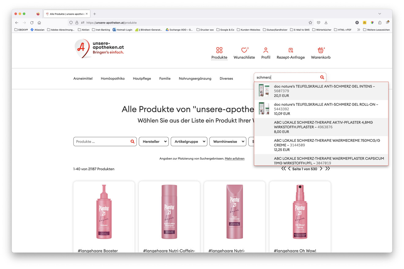"Willkommen auf Unsere-Apotheken.at, dem offiziellen Online-Marktplatz für österreichische Apotheken, beauftragt vom Österreichischen Apothekerverband. Über 150 unabhängige Apotheken präsentieren hier ihre eigenen Produkte auf einer zentralen Plattform und verwalten mühelos Tausende von Artikeln, dank unserer in Vorarlberg entwickelten Shop-Lösung. Keine komplizierten Kenntnisse notwendig. Einfach zu bedienen und leicht als neuer Verkaufskanal für jede Apotheke im Geschäft zu integrieren.