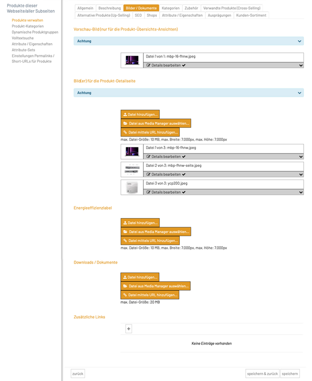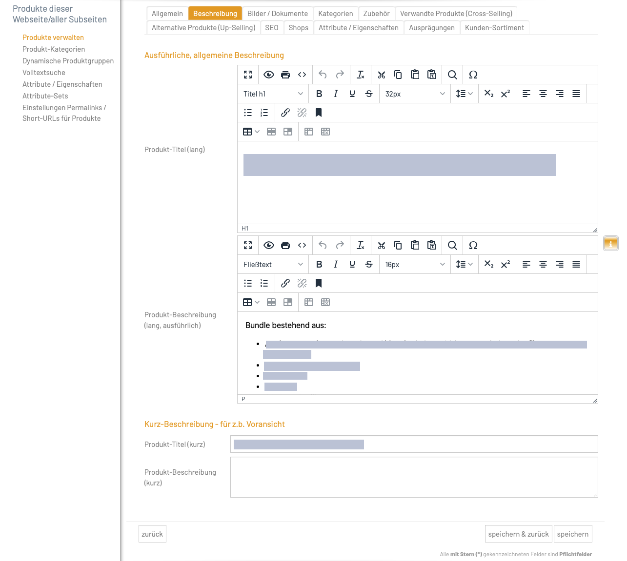 In der Detailansicht jedes Produkts nimm gezielte Einstellungen im CMS vor, von Allgemein über Beschreibung bis hin zu SEO-Optimierungen. Unser CMS-System ermöglicht die Verwaltung von Zubehör, Cross-Selling/Up-Selling und individuellen Produktlayouts. Dank einer Vielzahl von Attributen und der individuellen Zuordnung zu Kundensortimenten behältst du die Kontrolle über jede Facette deiner Produktdaten.